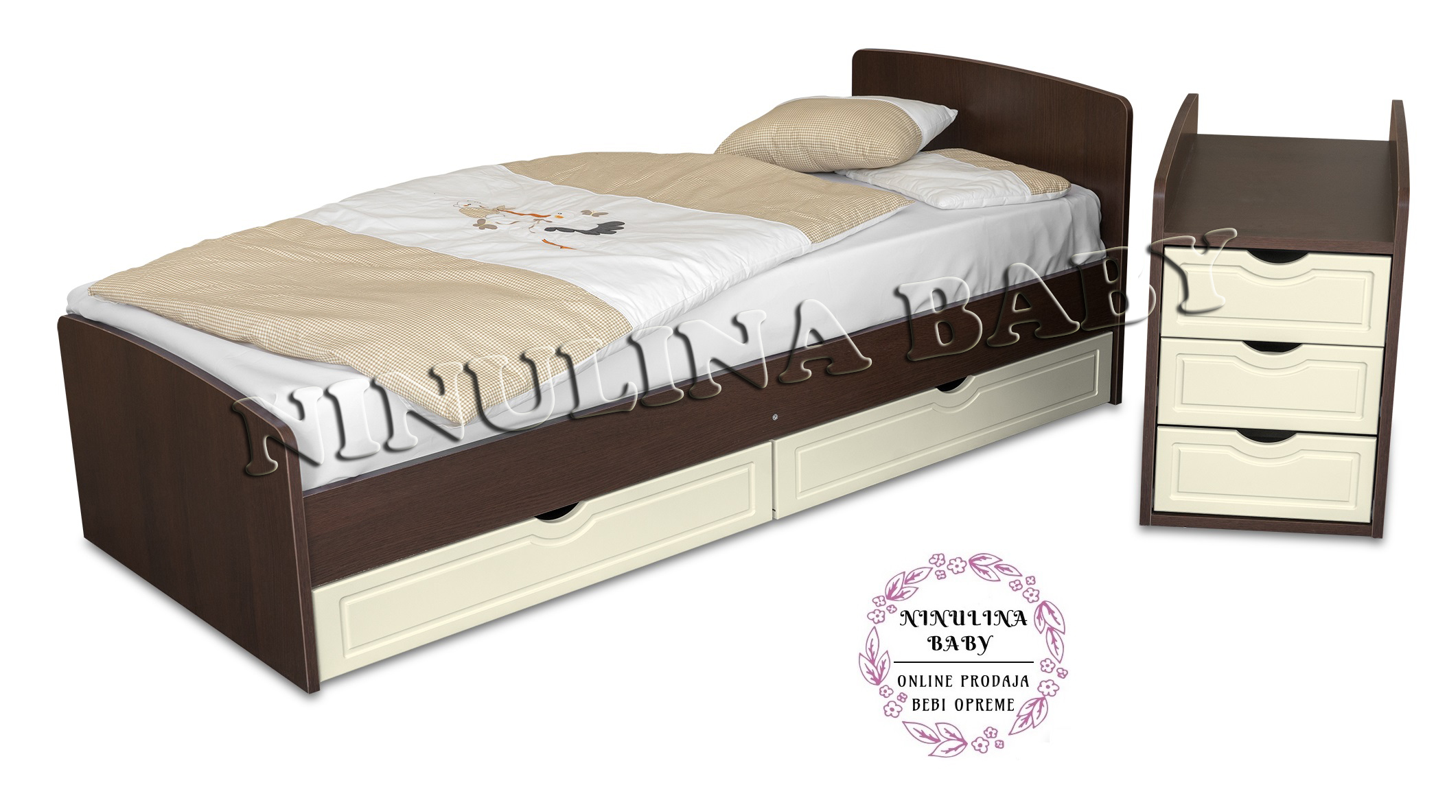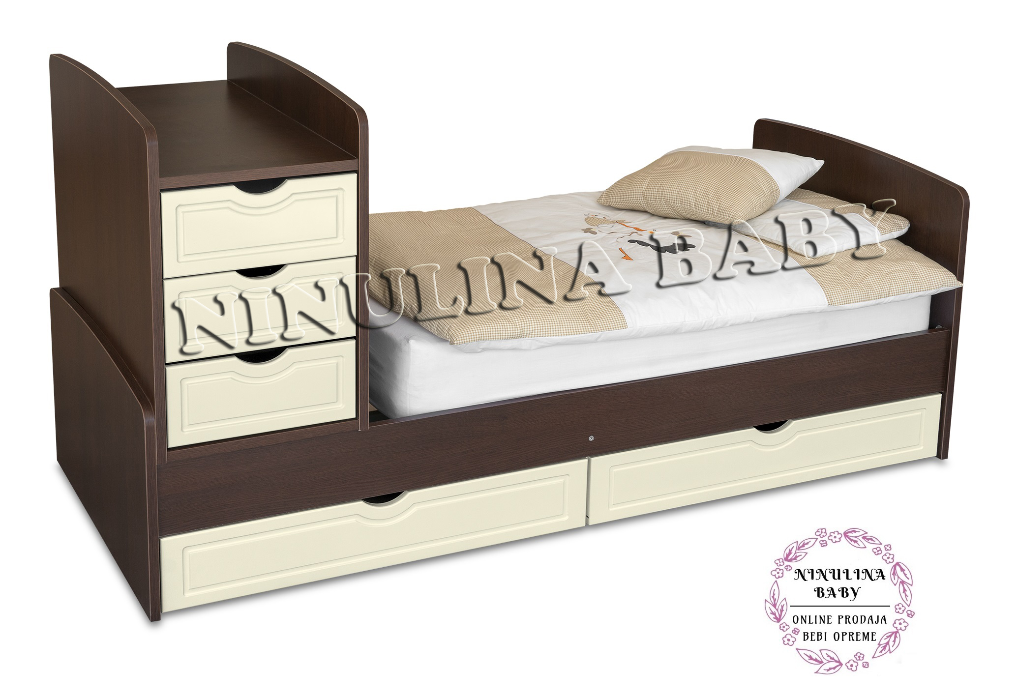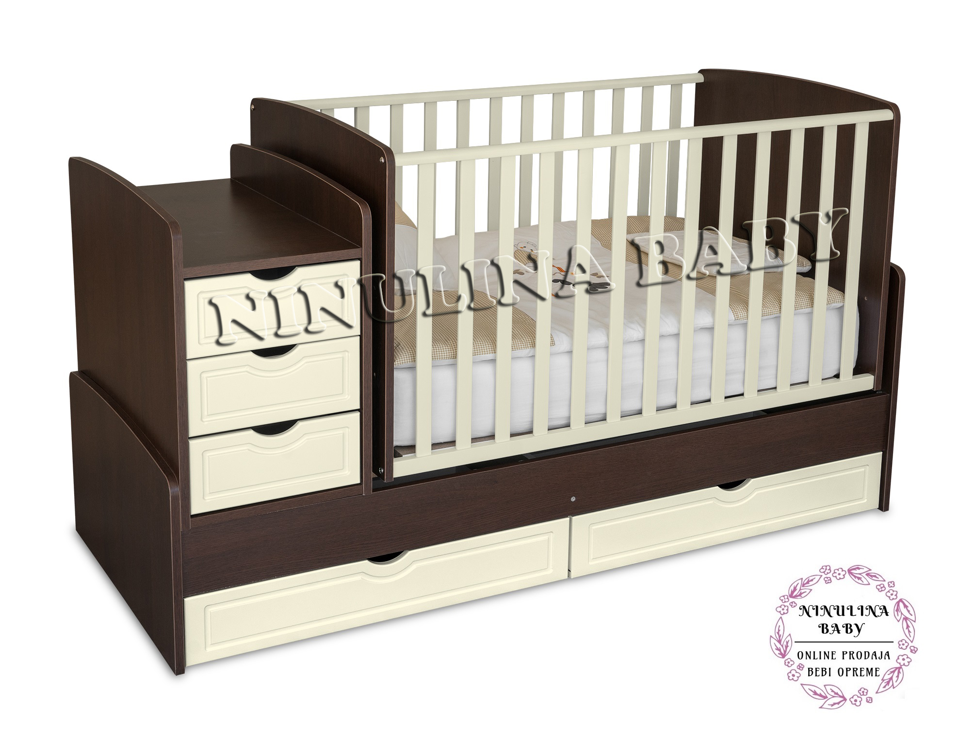 Komodica sa delom za presvlačenje. Krevet koji moze da se koristi do 12 godina. Krevetac koji se ljulja. Dva nivoa dušeka.